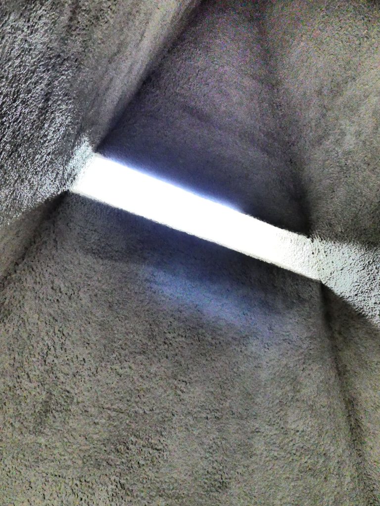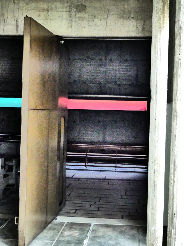 Que sa pénétration soit contrôlée  par la présence de loggias, par les panneaux Mondrian ou par les canons et interstices, latéraux ou non, par lesquels elle s’infiltre dans l’église, la crypte ou l’oratoire pyramidal;
