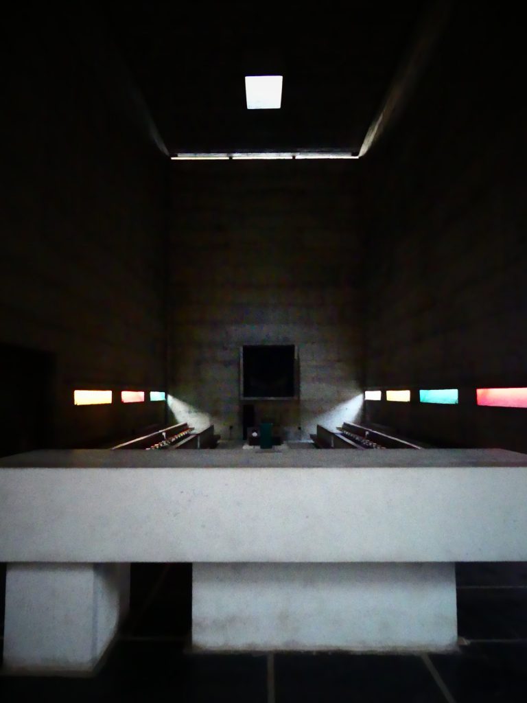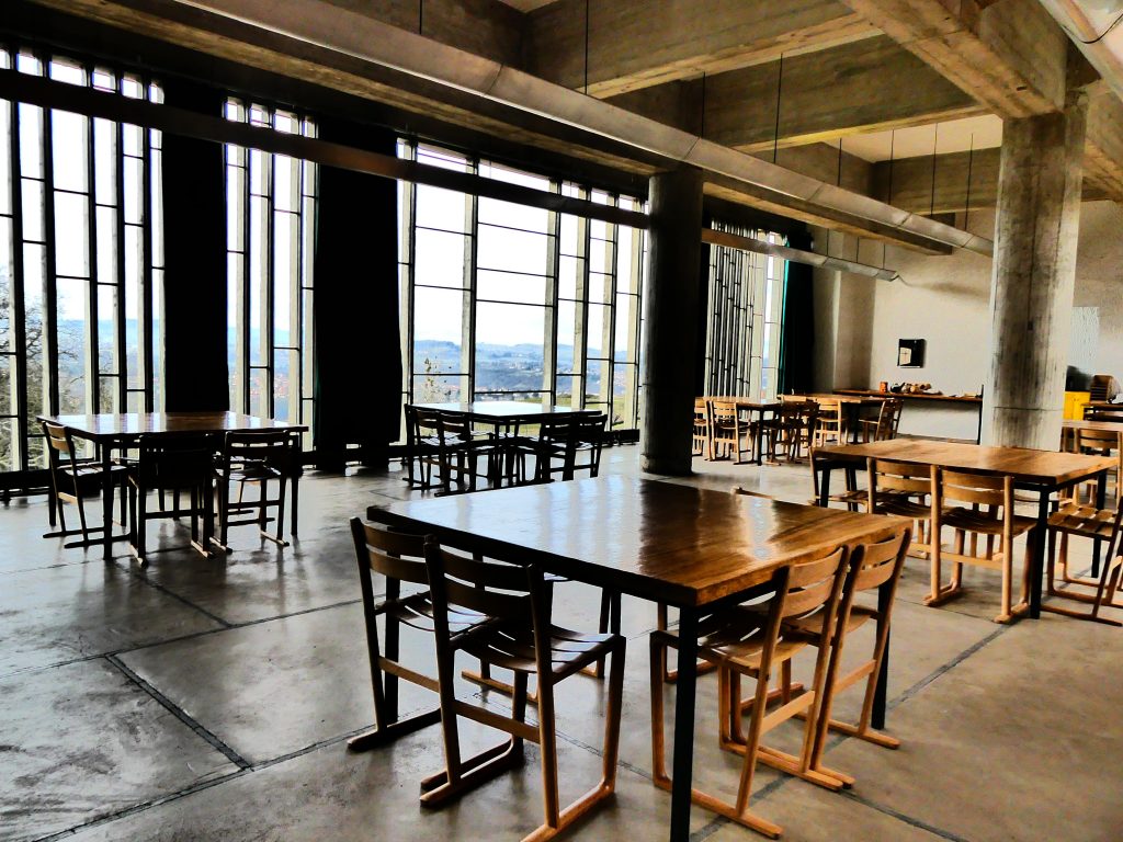 Traduisant le principe d’austérité prôné aussi bien par le choix d’un bâti réalisé en béton armé brut et dépourvu, comme pour revenir à l’essentiel, de fioritures que par celui d’un dépouillement, clairement assumé, s’affichant dans l’église et le réfectoire;Â