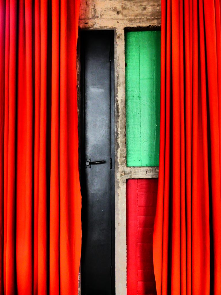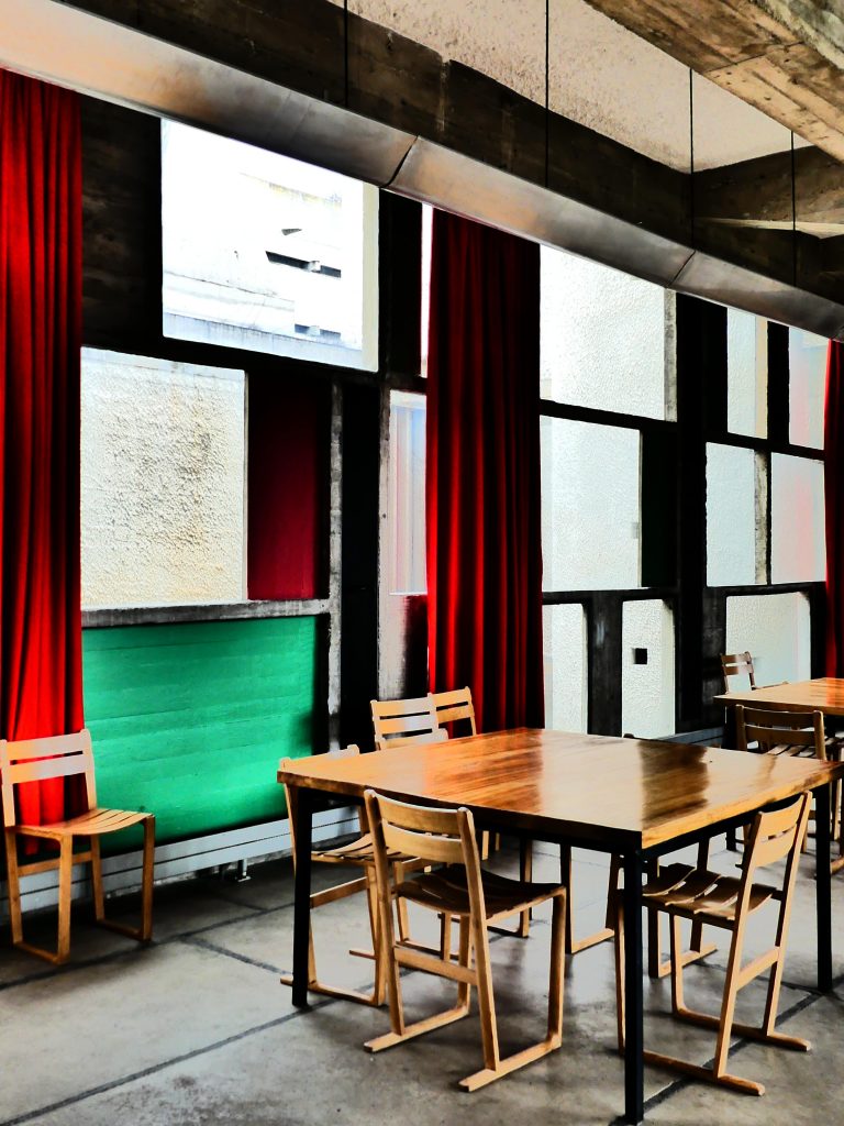 Chères au Corbusier, les couleurs primaires (avec une prédominance du jaune, vert, bleu et rouge) qui, des carreaux de verre Mondrian à la cuisine du réfectoire en passant par les volets des systèmes de ventilation, les meubles disposés ça et là ainsi que les murs et plafonds colorés de la chapelle et de la crypte, habillent avec parcimonie l’intérieur de Sainte Marie de la Tourette, expriment à leur tour cette vision plus contemporaine de l’architecture sacrée vue par le maître d’Å“uvre.