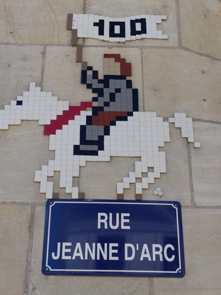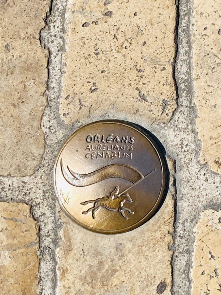 clous de pavages , réalisé par Yann Hervis, mentionnant les trois noms successivement donnés, au cours des siècles, à Orléans et figurant, par ailleurs, Jeanne d’Arc portant son emblématique étendard