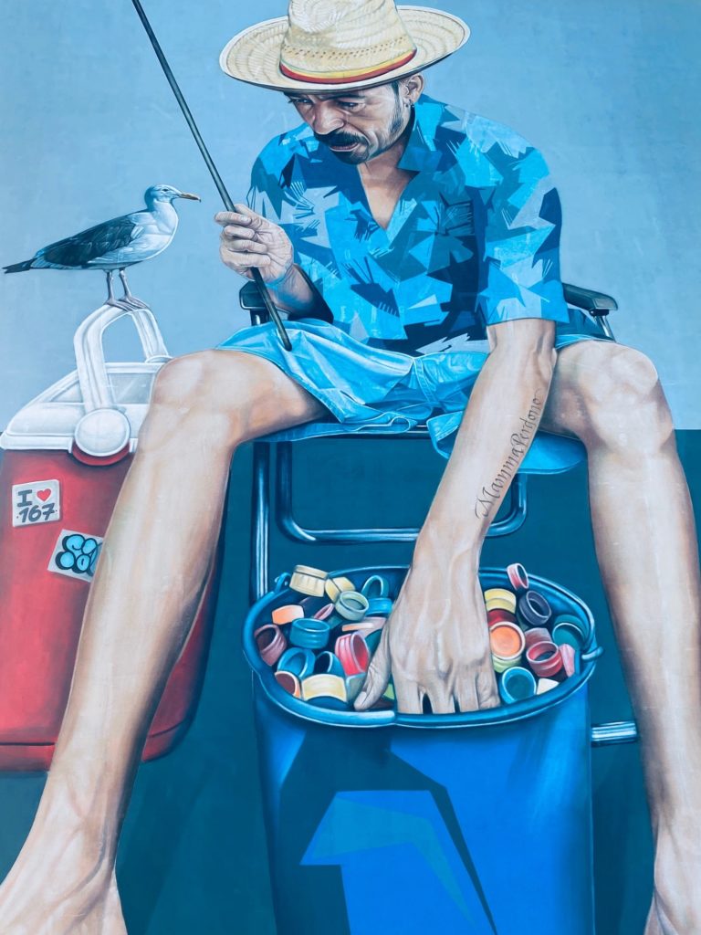 Evoquant la croissante pollution, symbolisée par les bouchons en plastique péchés en lieu et place des poissons, de la mer.