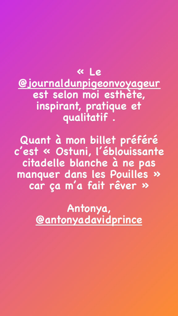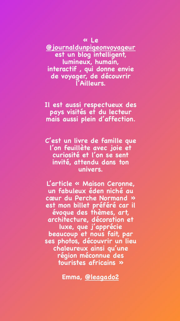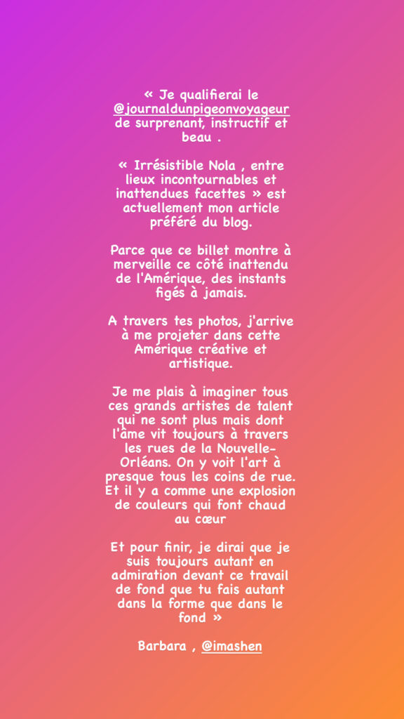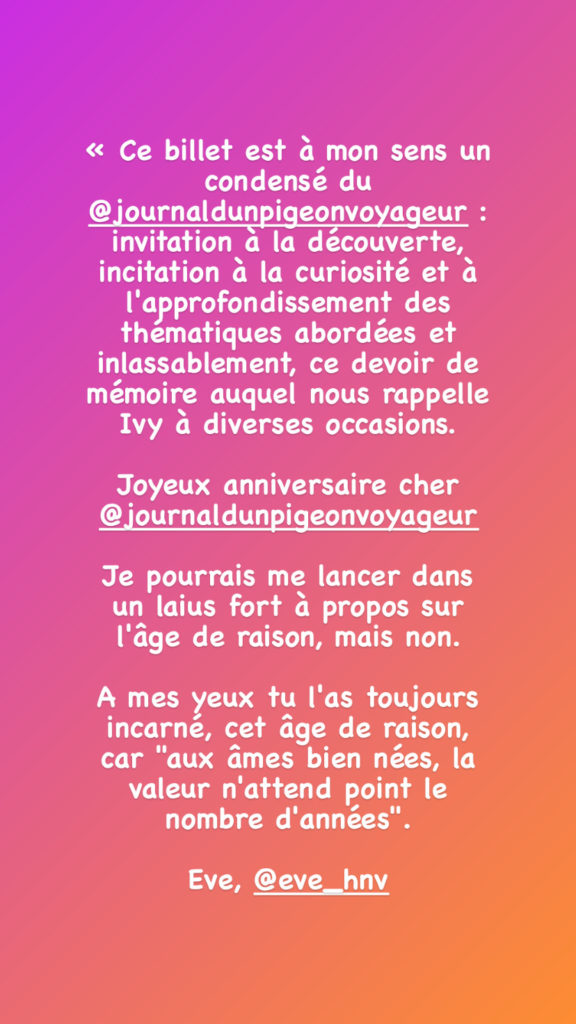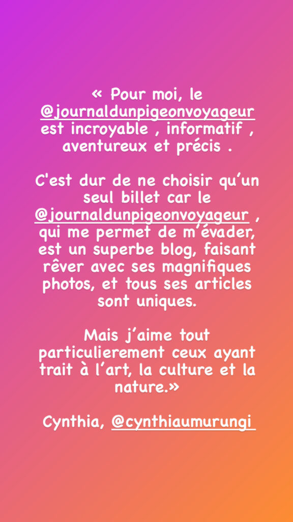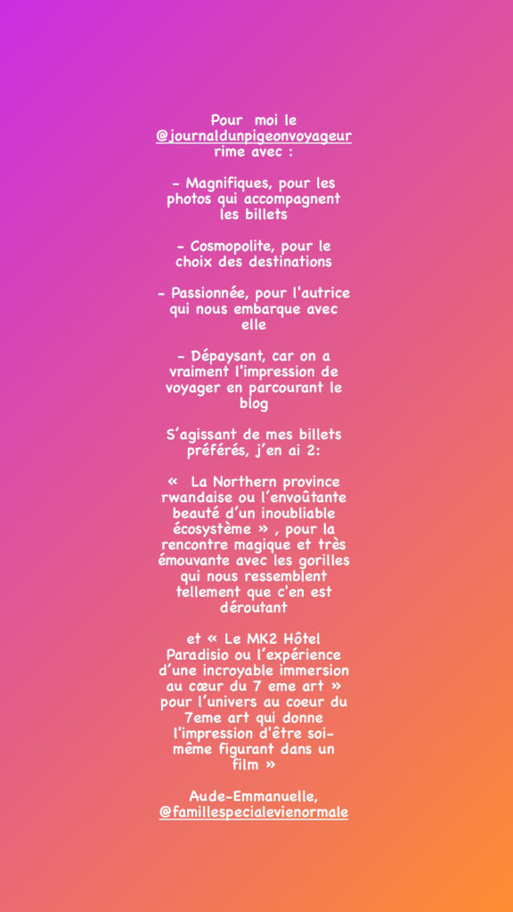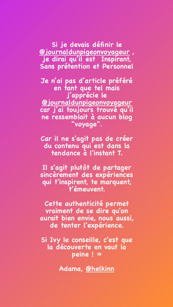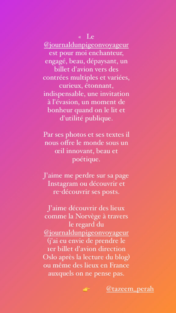 Et parce que certains d’entre vous ont, lundi, été dans l’impossibilité d’accéder à la storie Instagram du blog ou, s’y étant rendus, n’ont pas eu le temps, avant leur disparition au bout de 24 heures, de parcourir tous les témoignages postés, j’ai ainsi décidé, afin d’assurer leur pérennité, d’également les publier ici.