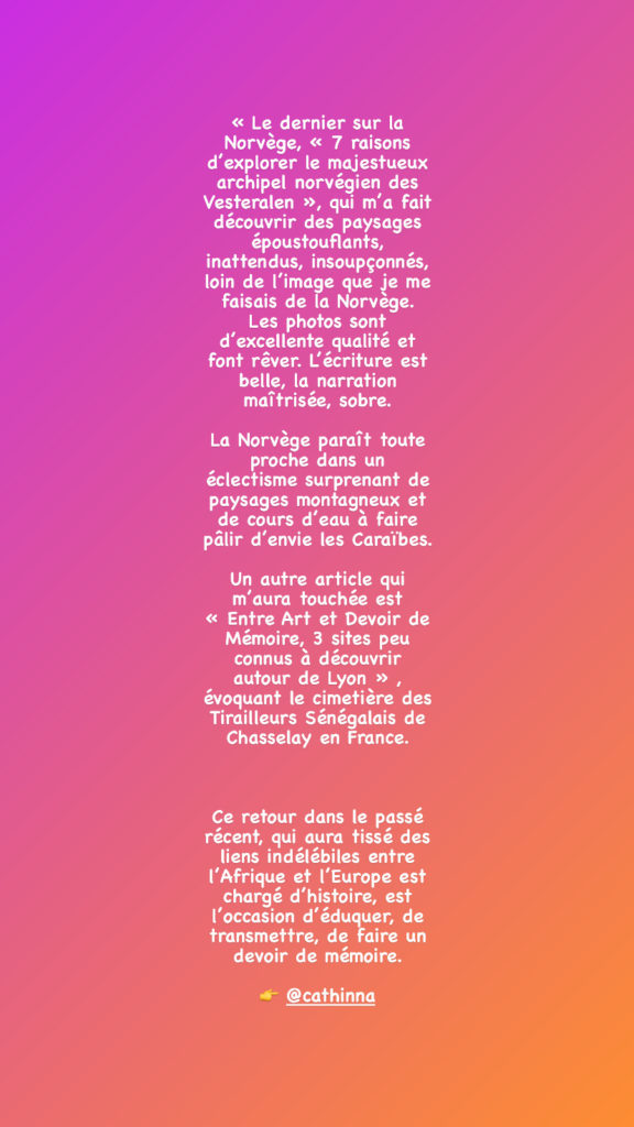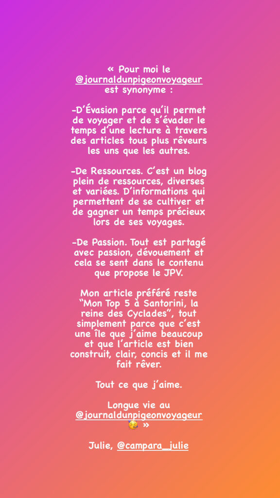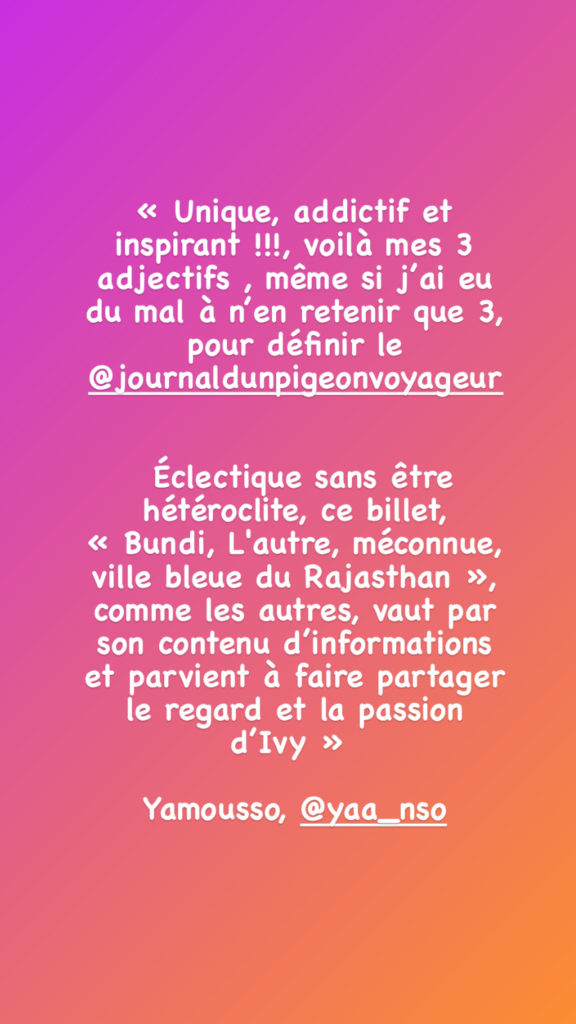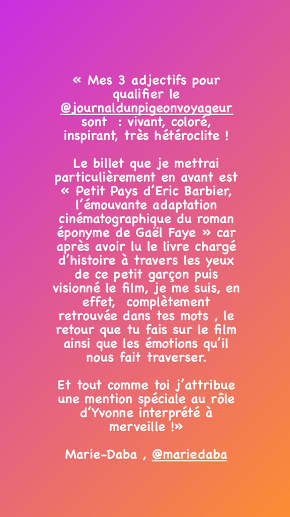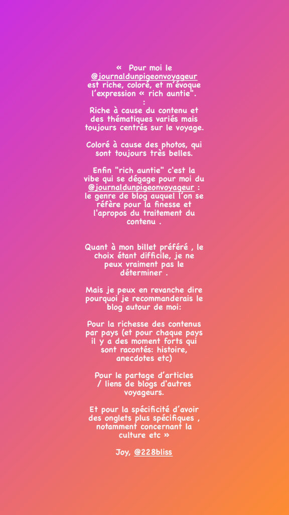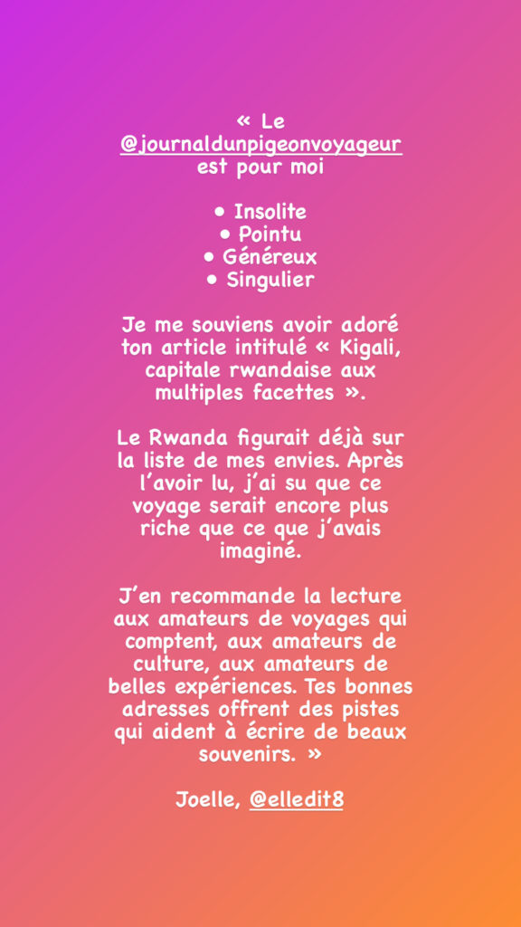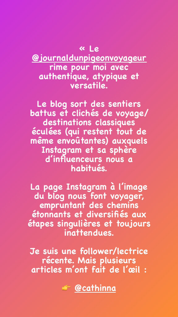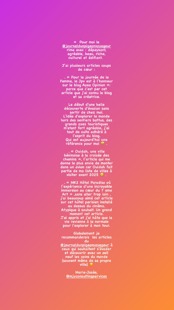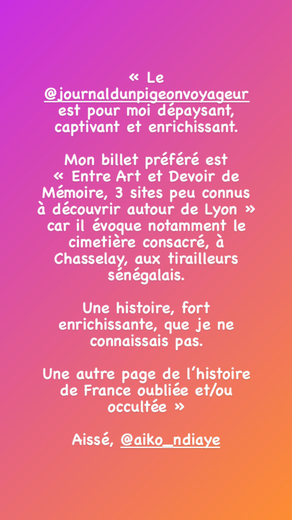 Et parce que certains d’entre vous ont, lundi, été dans l’impossibilité d’accéder à la storie Instagram du blog ou, s’y étant rendus, n’ont pas eu le temps, avant leur disparition au bout de 24 heures, de parcourir tous les témoignages postés, j’ai ainsi décidé, afin d’assurer leur pérennité, d’également les publier ici.
