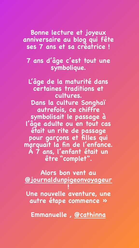 Il y a trois jours, le Journal d’un Pigeon Voyageur a soufflé, ce dont je n’en reviens toujours pas moi-même, sa 7 ème bougie .