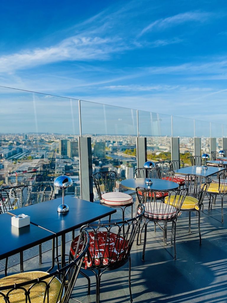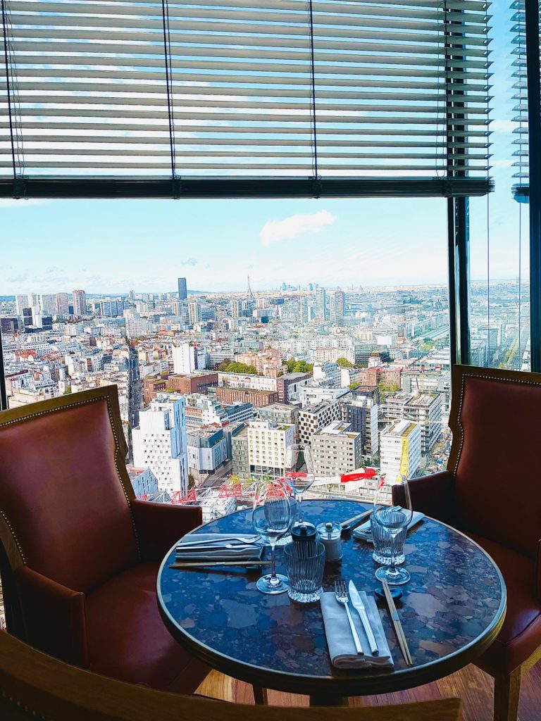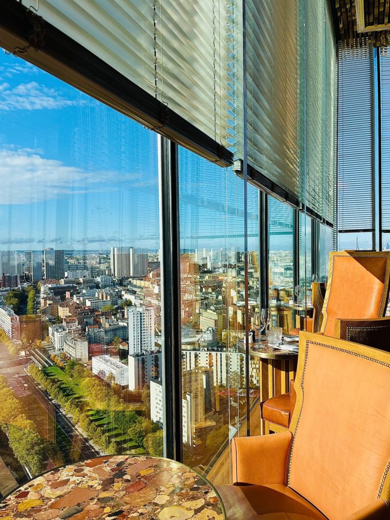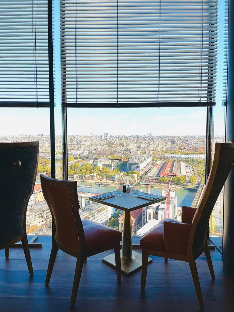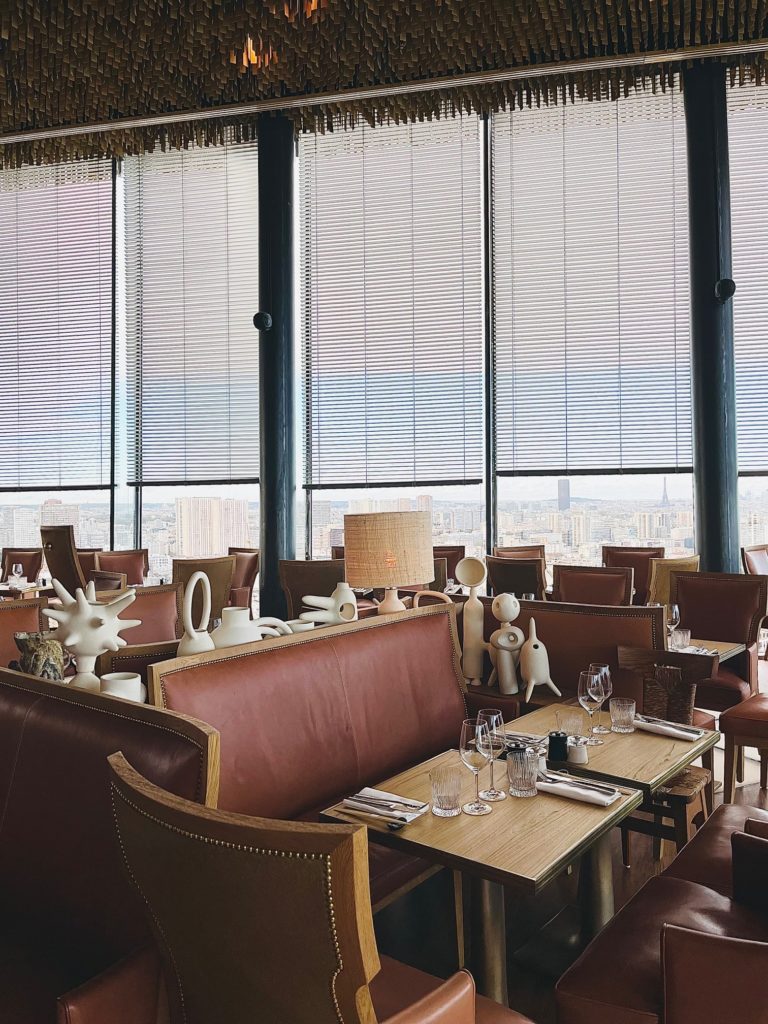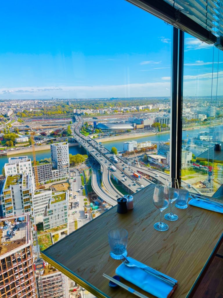 Conjuguant avec brio, à plus de 100 mètres d’altitude, lumière naturelle irradiante; exceptionnelle hauteur sous plafond; Å“uvres d’art réalisées par Ara Starck et Pierre Monestier ;  mobilier design où le bois domine (avec un coup de cÅ“ur en ce qui me concerne pour les assises, placées près des fenêtres donnant sur la Seine, permettant de s’installer en amoureux); joli bar et vertigineux panoramas sur la bouillonnante Ville Lumière.