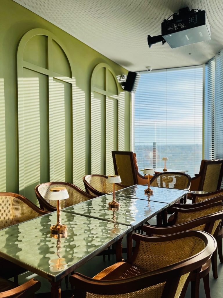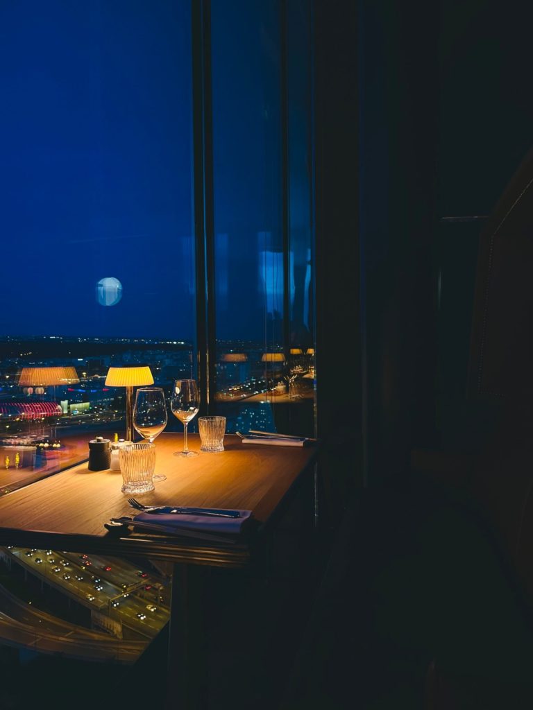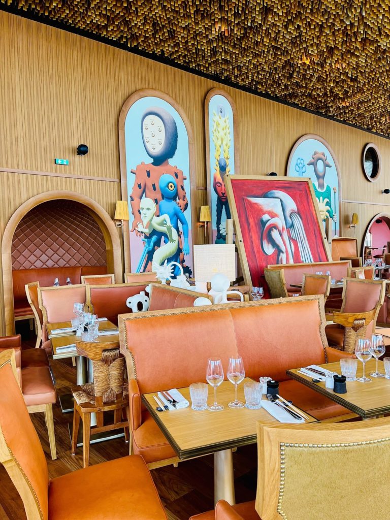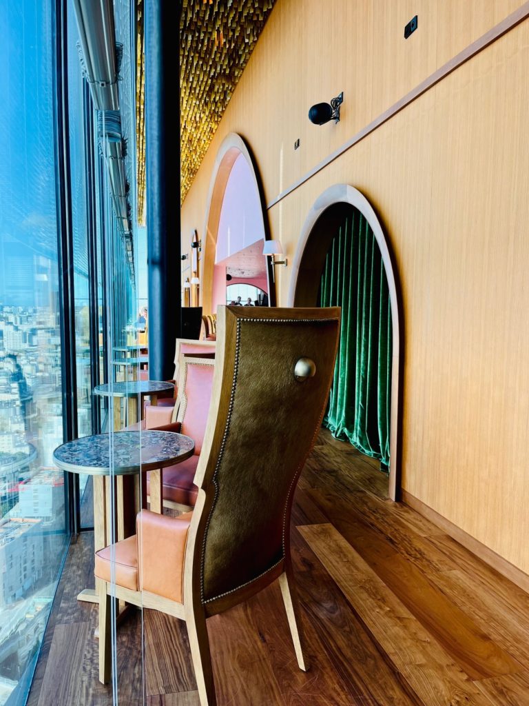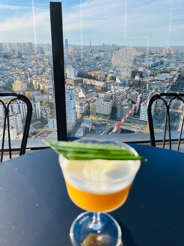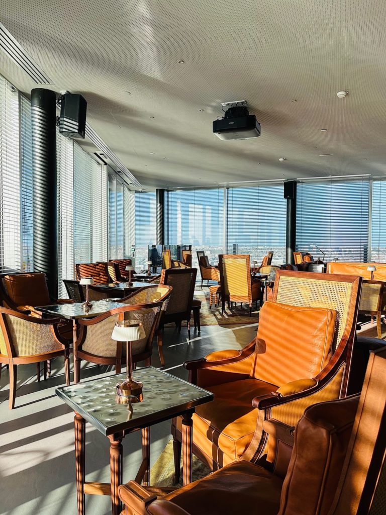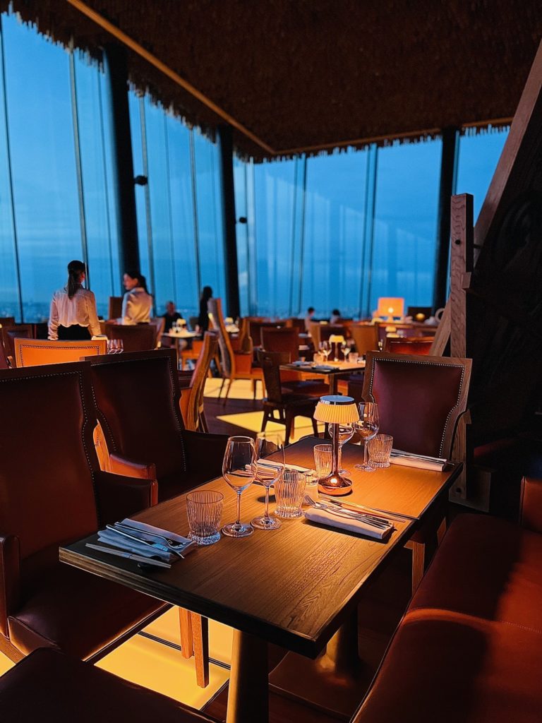Conjuguant avec brio, à plus de 100 mètres d’altitude, lumière naturelle irradiante; exceptionnelle hauteur sous plafond; Å“uvres d’art réalisées par Ara Starck et Pierre Monestier ;  mobilier design où le bois domine (avec un coup de cÅ“ur en ce qui me concerne pour les assises, placées près des fenêtres donnant sur la Seine, permettant de s’installer en amoureux); joli bar et vertigineux panoramas sur la bouillonnante Ville Lumière.