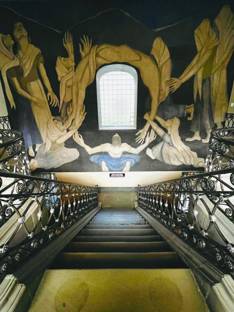 ou l’inattendue fresque de Manuel Rodriguez Lozano, occupant l’escalier central, évoquant la Shoah.Â