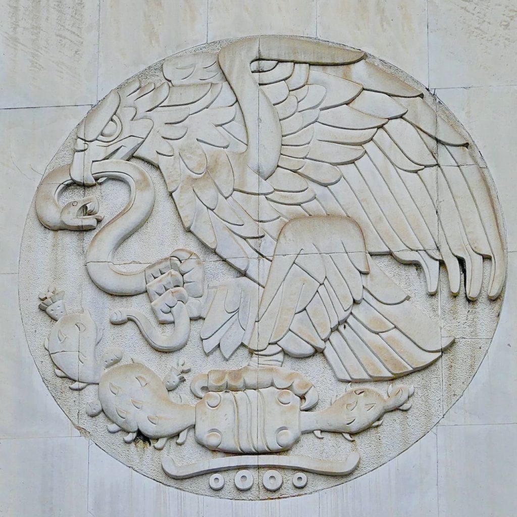 centro historico, représentation de la légende de Tenochtitlan ( alias Mexico City) d’après laquelle les dieux auraient indiqué aux Aztèques de fonder leur capitale à l’endroit où ils verraient un aigle, posé sur un cactus, en train de dévorer un serpent.