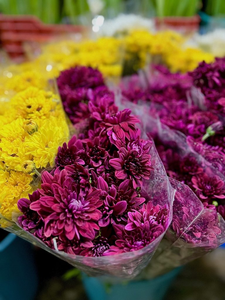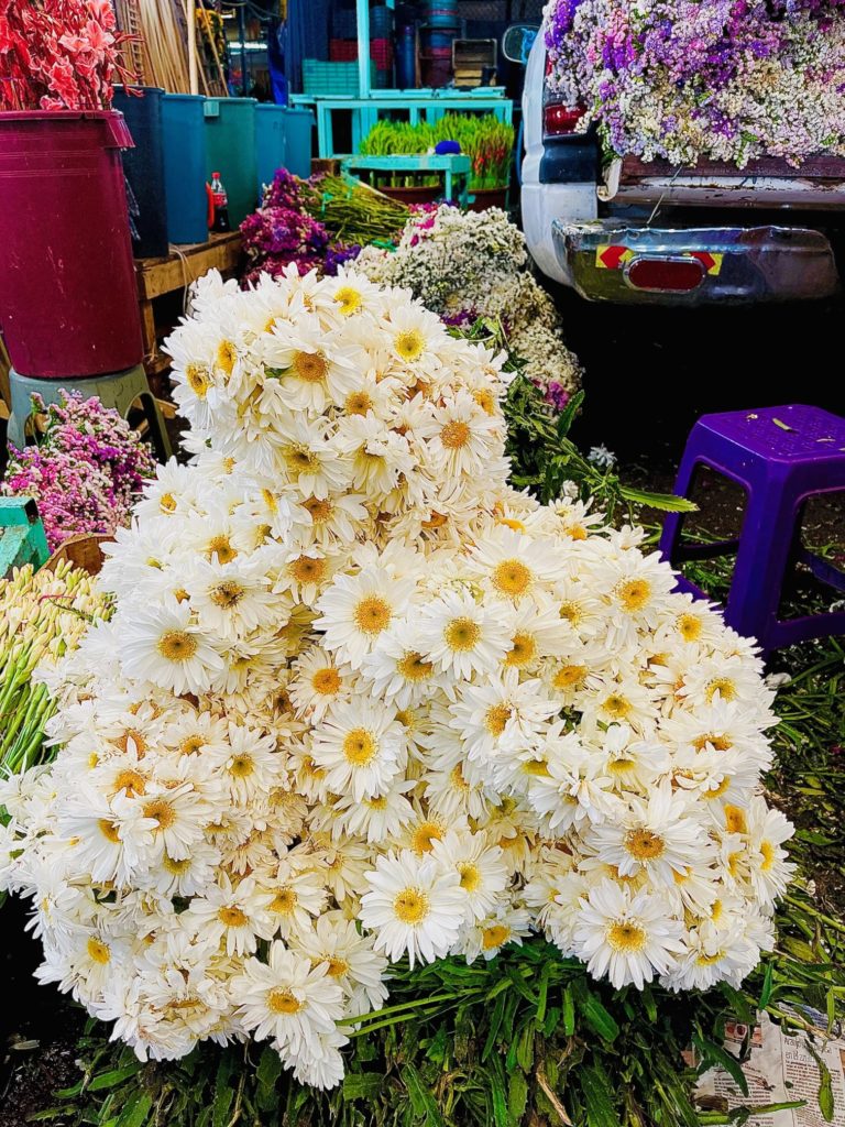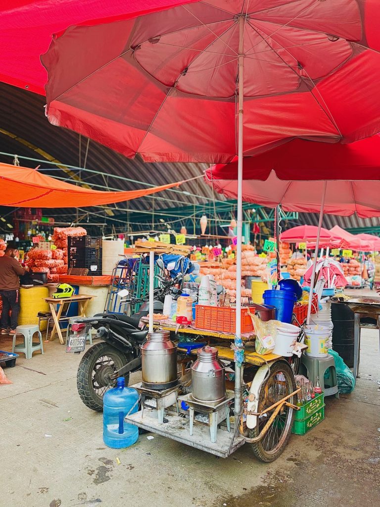 les vendeurs de jouets et autres accessoires outre les marchands de boissons et d’élotes (épis de mais grillés saupoudrés , au choix, de sel-citron-piment ou au contraire recouverts de fromage fondu) hélant le chaland depuis leurs barques;