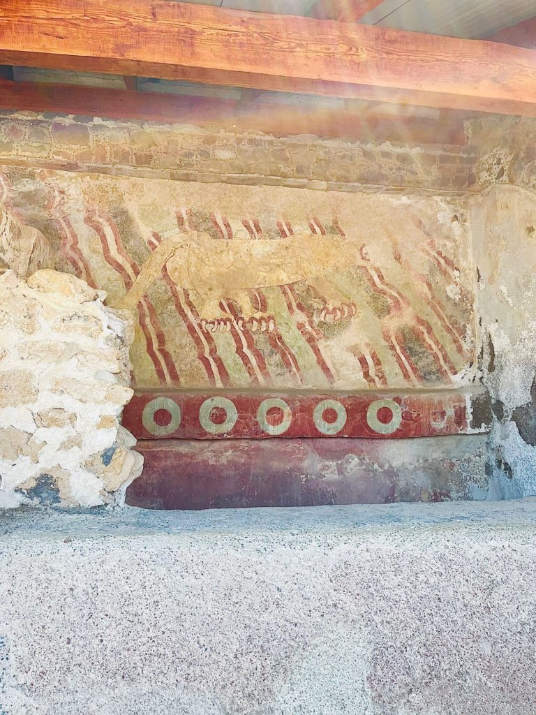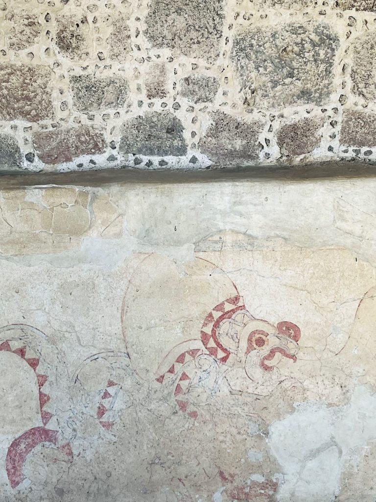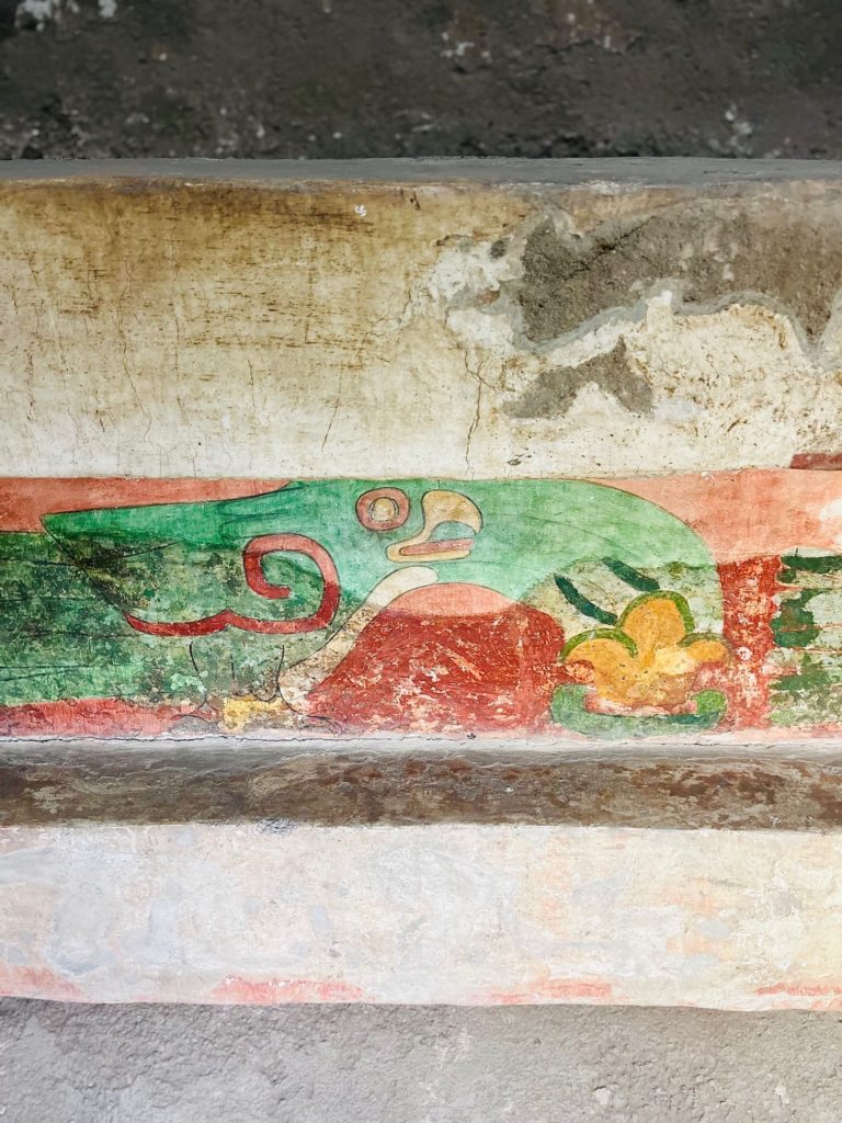 ainsi que les palais adjacents de Quetzalpapalotl et de Los Jaguares, respectivement décorés de peintures murales représentant des têtes de serpent , d’oiseau et des jaguars, sont tout simplement fascinants .