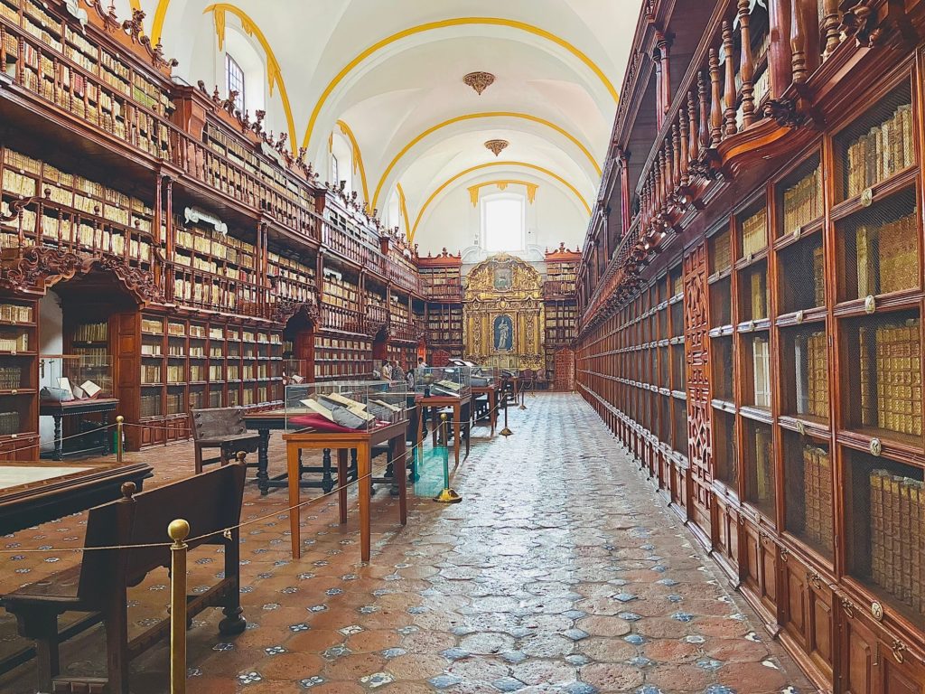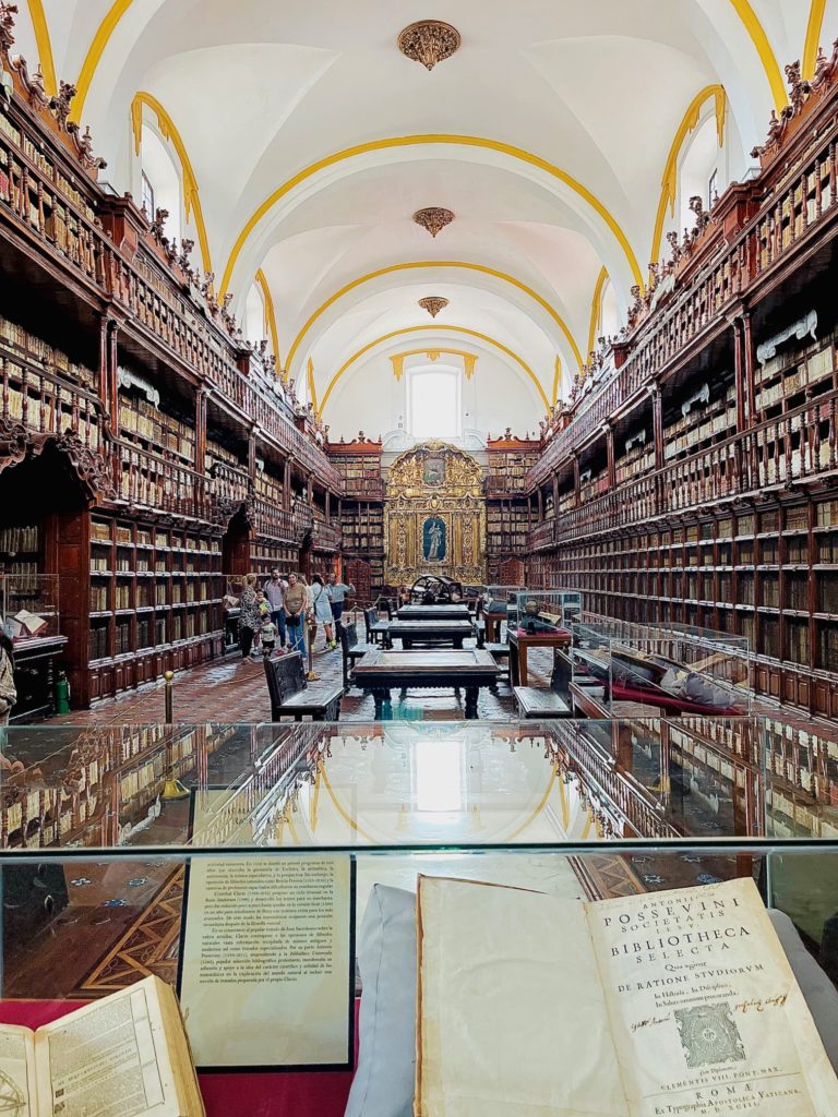Face à la spectaculaire bibliothèque publique, entièrement réalisée en bois, Palafoxiana, abritant plusieurs dizaines de milliers d’ouvrages très anciens