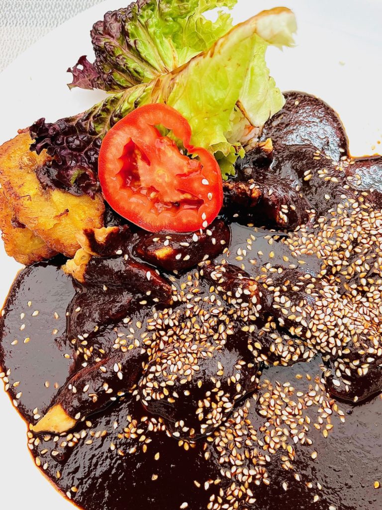 Mariant tout à la fois l’onctuosité du chocolat, la subtilité d’une multitude de piments et d’épices, parmi lesquels figure l’incontournable piment poblano ainsi que du poivron séché, la douceur de la tomate et des amandes, la saveur des cacahuètes ainsi que le croquant du sésame.