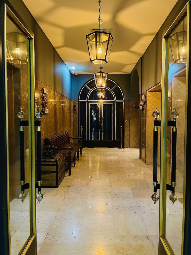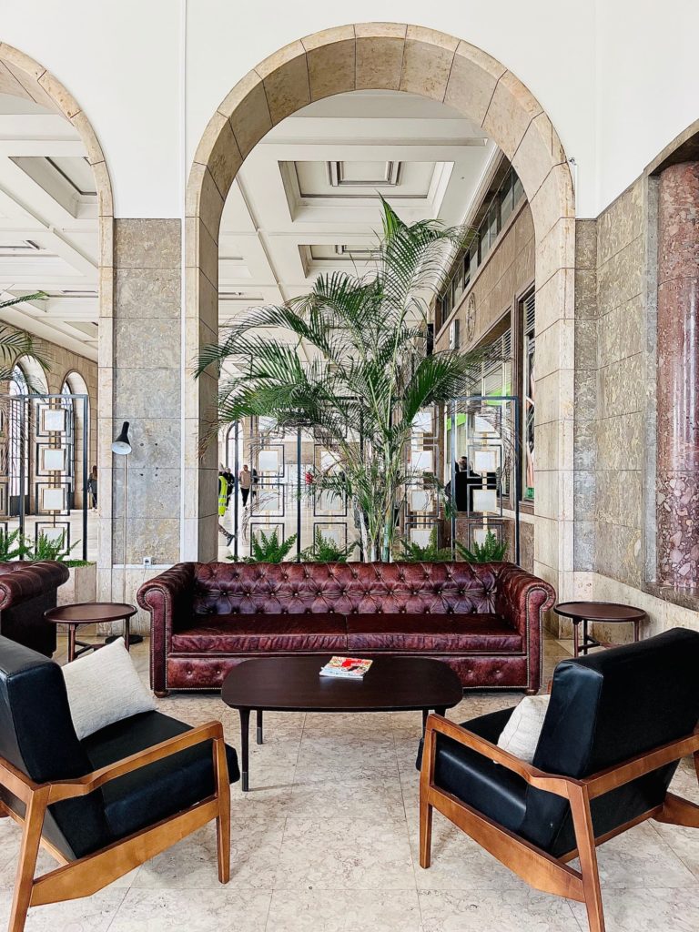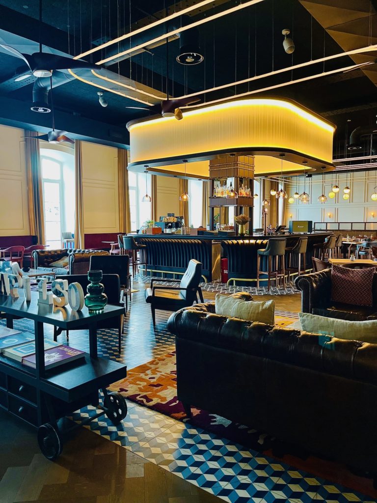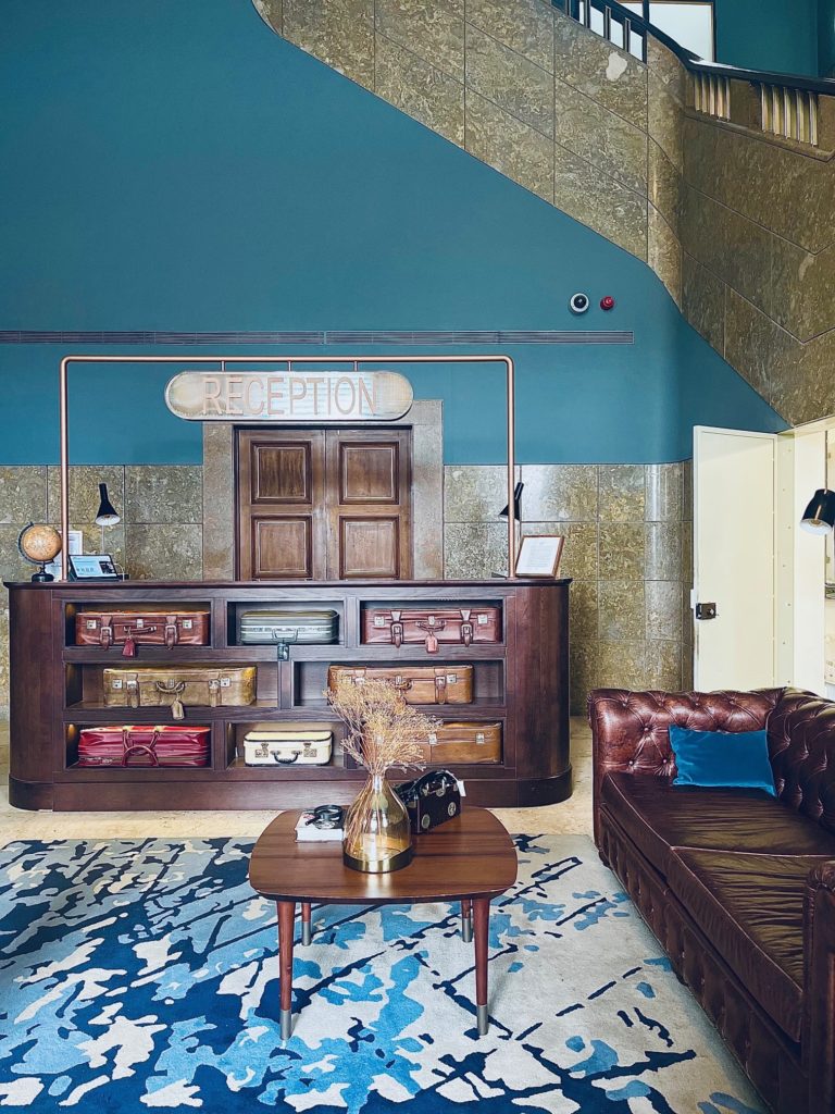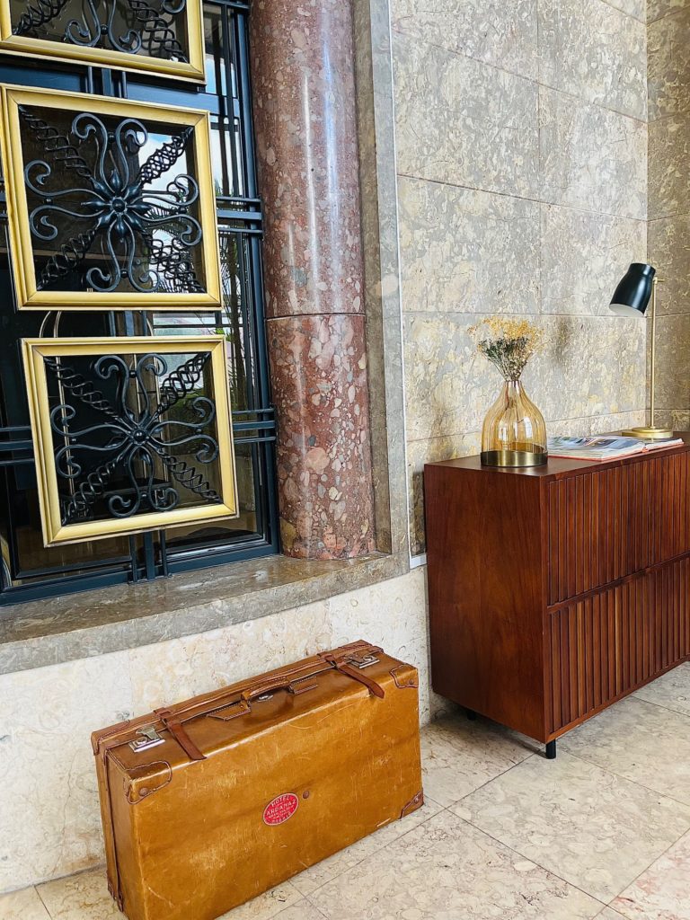 Le mobilier, évoquant  indifféremment émigrations, aurevoirs, retours, nouveaux départs et découvertes, du très design lobby, en faisant la part belle aux valises, malles, téléphones vintage et autres accessoires de voyage donne ainsi, au rez-de-chaussée, le là .