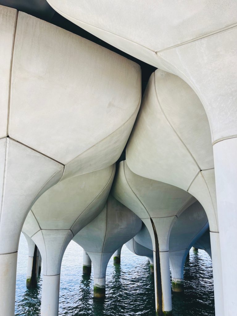 Dont la singularité tient tout autant à sa structure, reposant sur plus d’une centaine de pilotis en forme de tulipes, de différentes hauteurs, surplombant le fleuve Hudson,