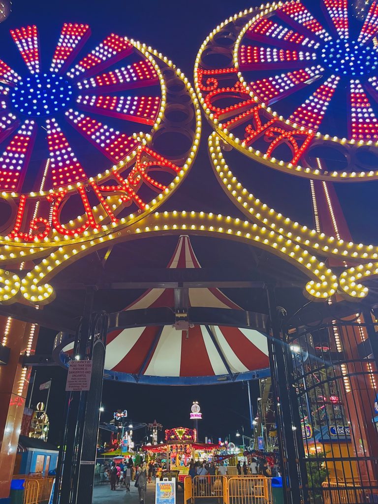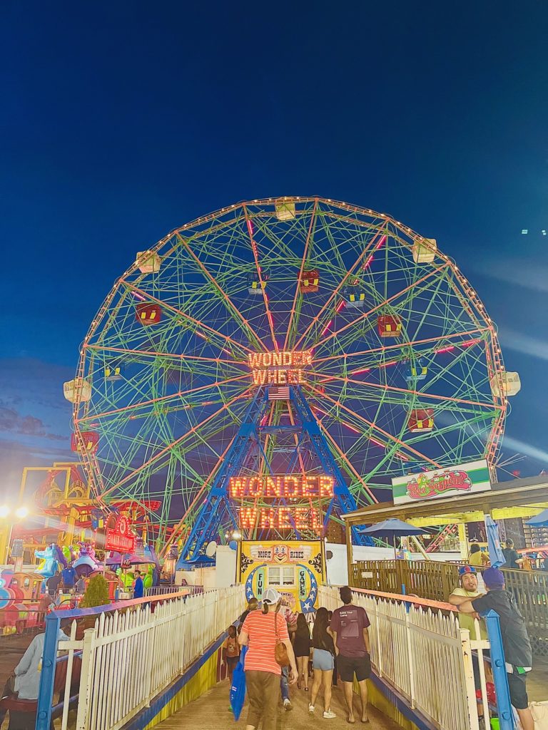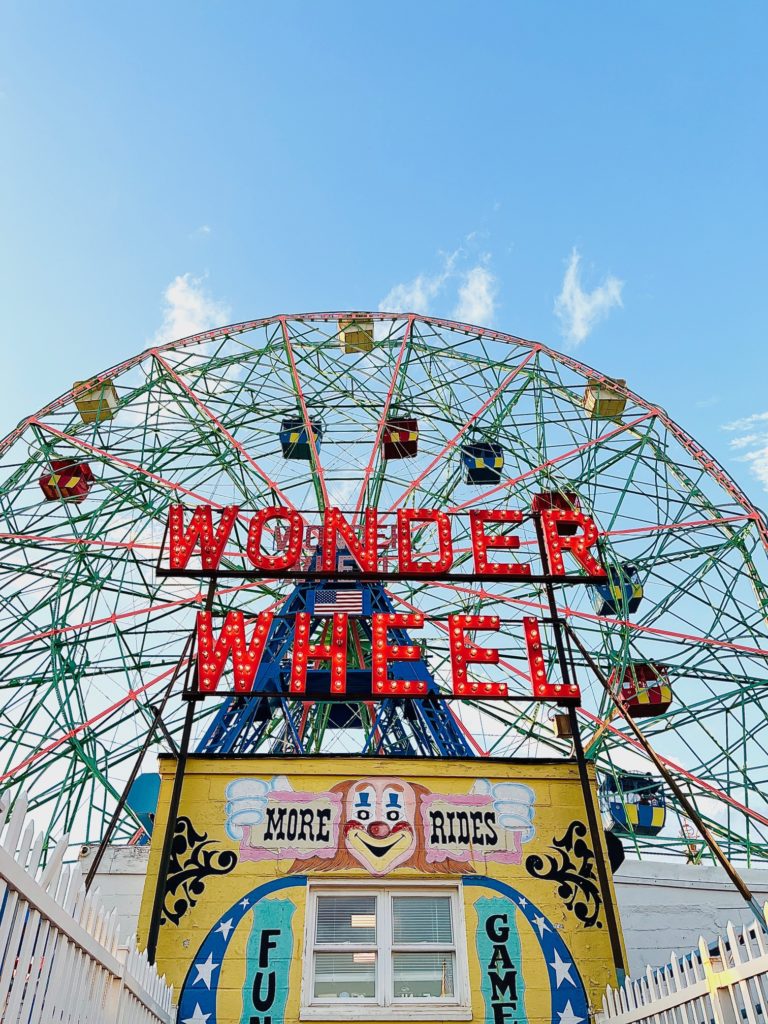 Commencez par monter à bord de la centenaire, grande roue, Wonder Wheel et prenez place dans l’une de ses nacelles blanches (ces dernières demeurant, contrairement à celles de couleur, immobiles)