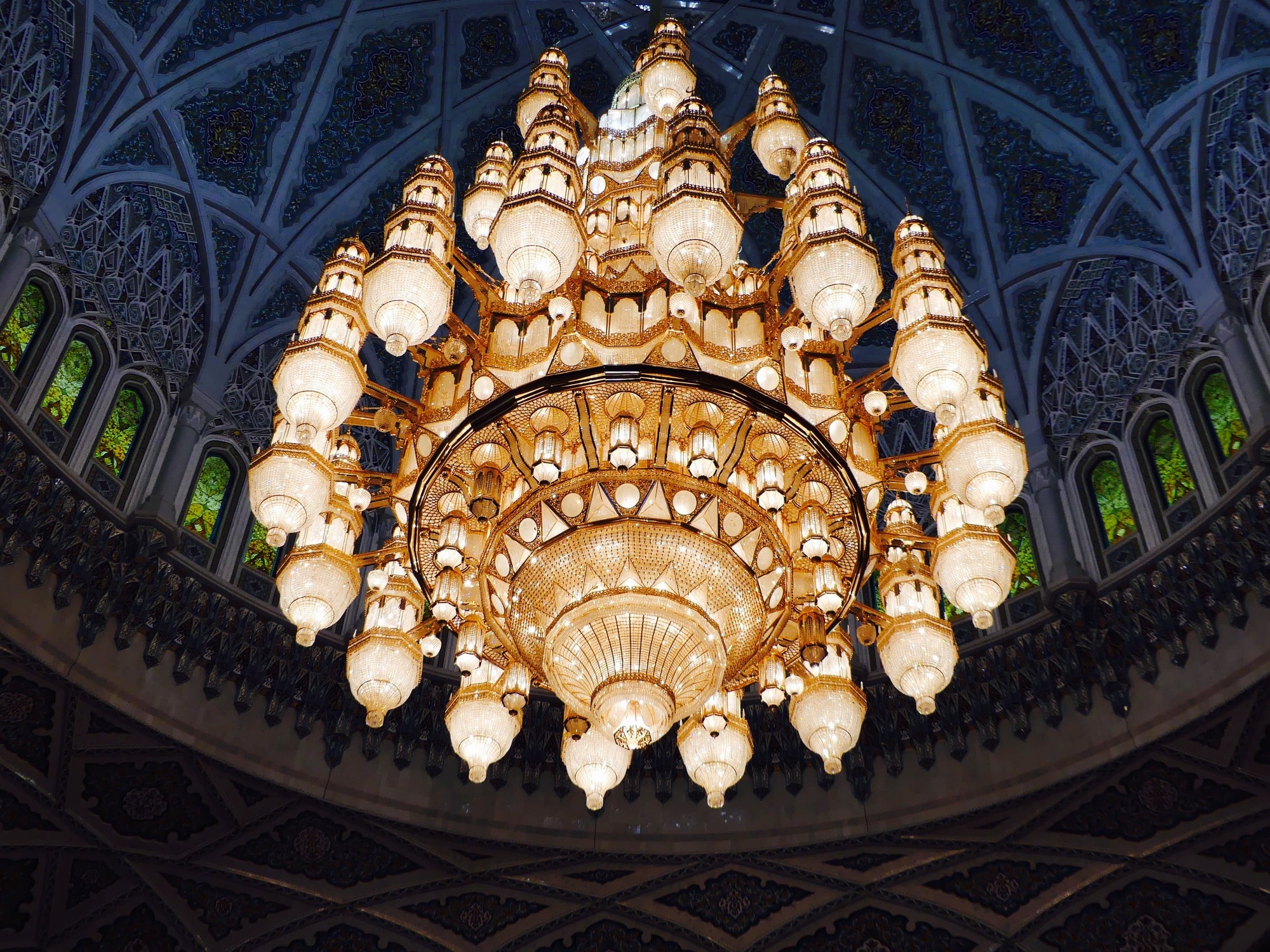 lustre en cristal Swarovski Salle de prière des Hommes.  Mosquée Sultan Qaboos        Dernière étape de mon envoûtant voyage, l'automne dernier, à Oman,  Mascate, sa multiséculaire capitale au charme suranné, m'a immédiatement séduite.      panorama sur la vieille ville de Mascate (en arrière plan se distinguent l'un des forts...