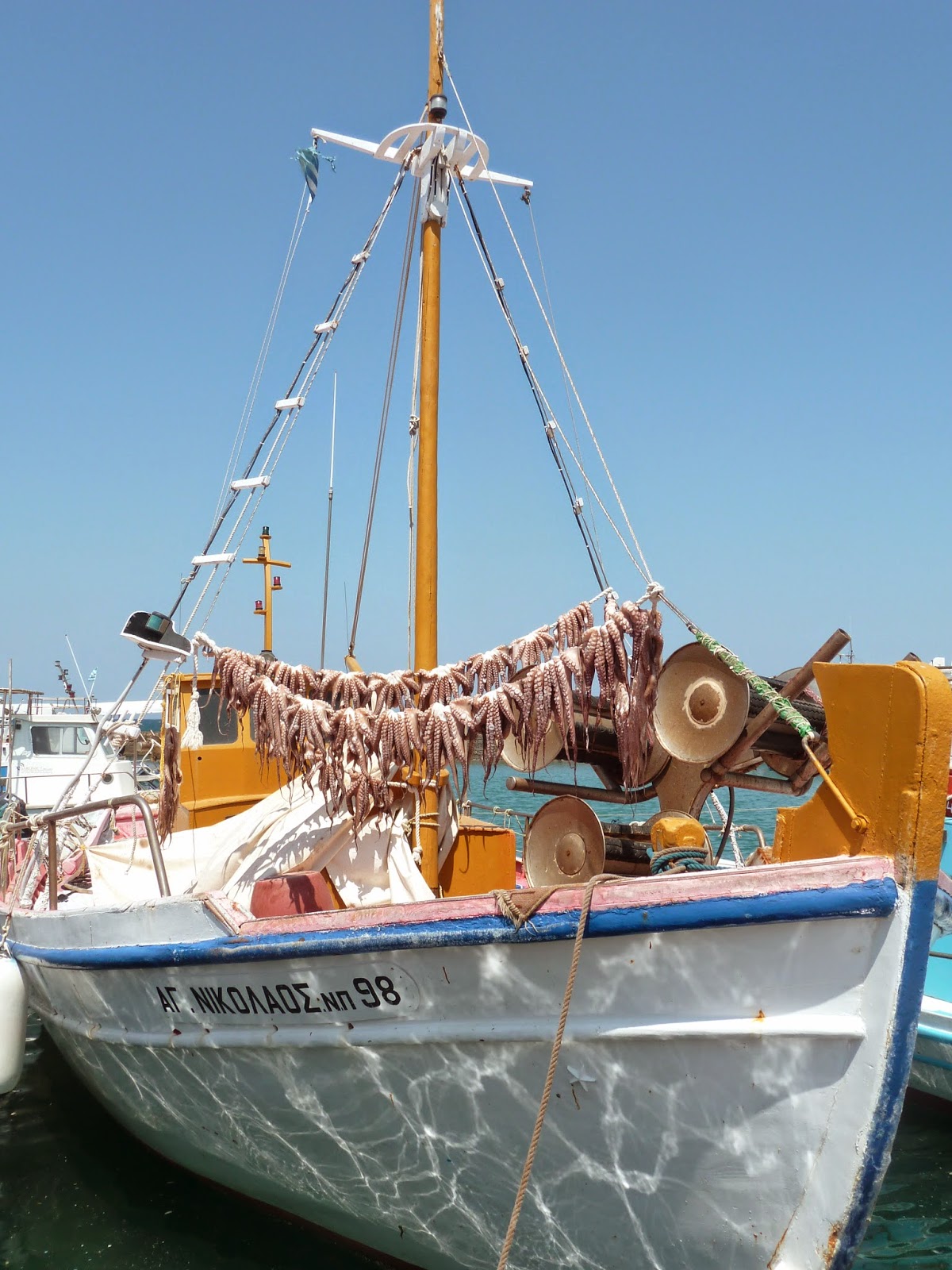poulpes séchant au soleil, bateau de pêche dans le port de Naoussa     Ma découverte de Mykonos achevée  et avant ma dernière halte à Santorin, j'ai poursuivi mon exploration des Cyclades en faisant escale, cette fois ci, au cœur même de l'archipel, sur l'île de Paros.   Après la folie festive ressentie sur l'île chère...