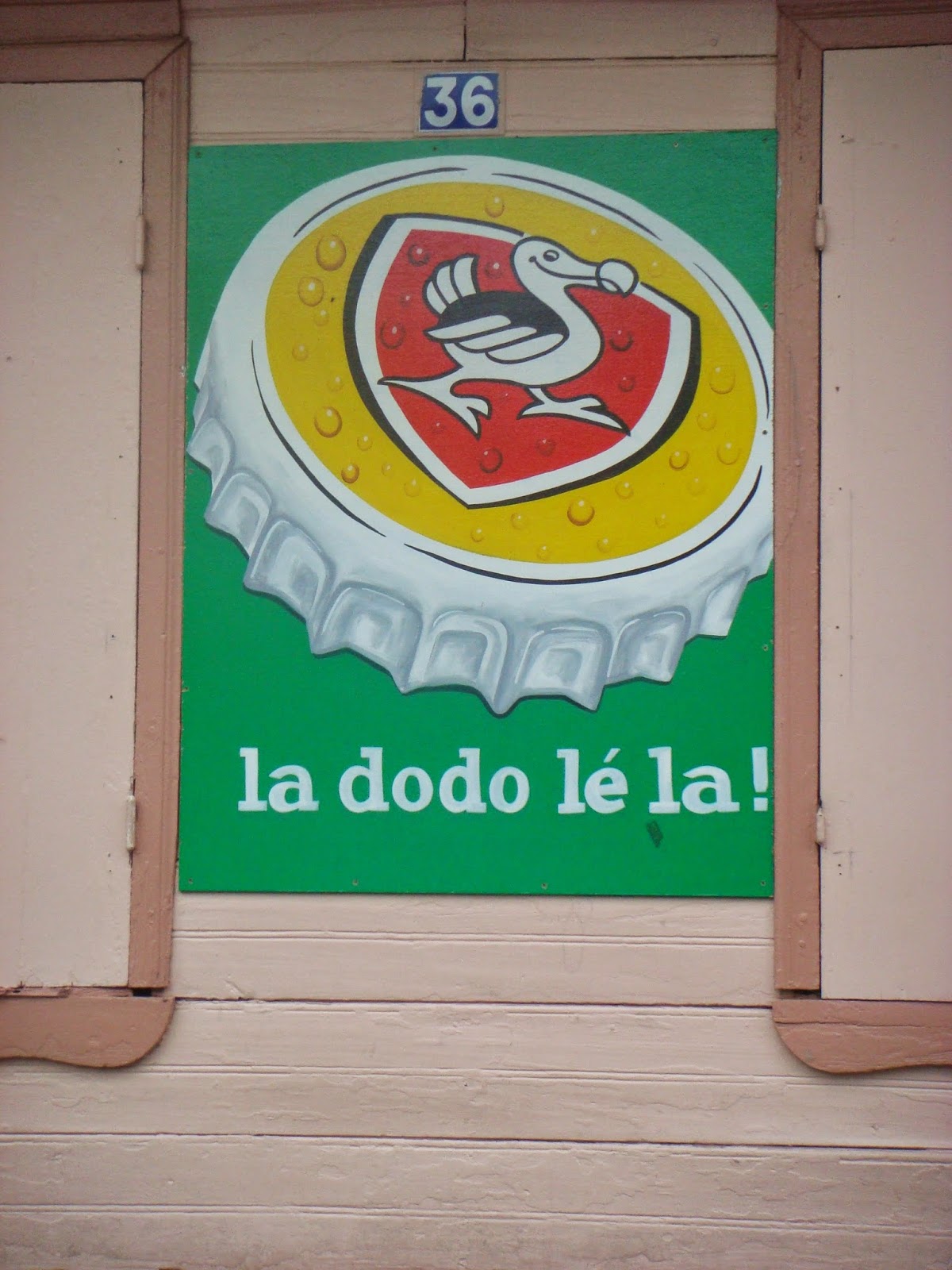 slogan de la marque de bière locale Bourbon, ayant pris le Dodo (oiseau aujourd'hui disparu) pour emblème,  placardé sur un mur dans le village d'Hellbourg Eh bien non ce n'est pas  encore l'heure du petit verre de whisky !  Encore que là où je vous emmène, le...
